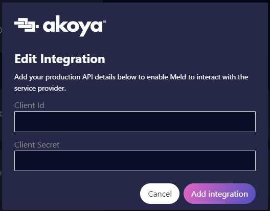 If you have your own Akoya account that you wish to integrate with Meld, you will need to provide the following credentials securely on the Meld Integrations Tab on the dashboard: