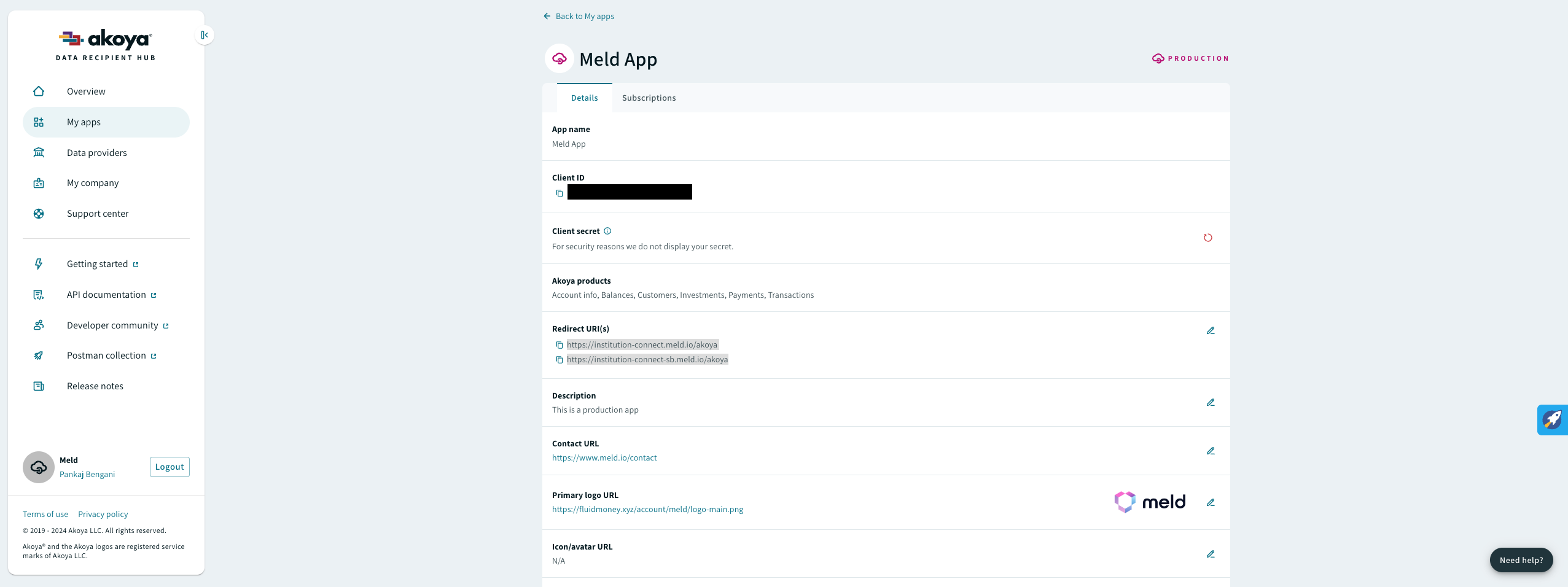 After that, in the Akoya dashboard, make sure for your app that you have set the redirect URIs to https://institution-connect-sb.meld.io and https://institution-connect.meld.io (which should be comma separated). They can be set on the page shown below: