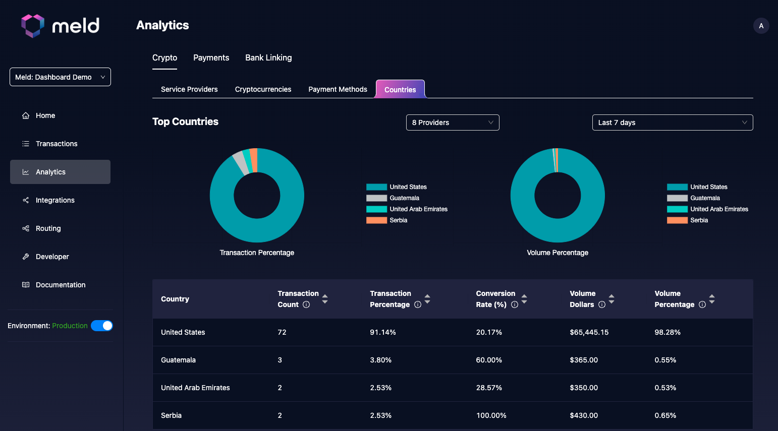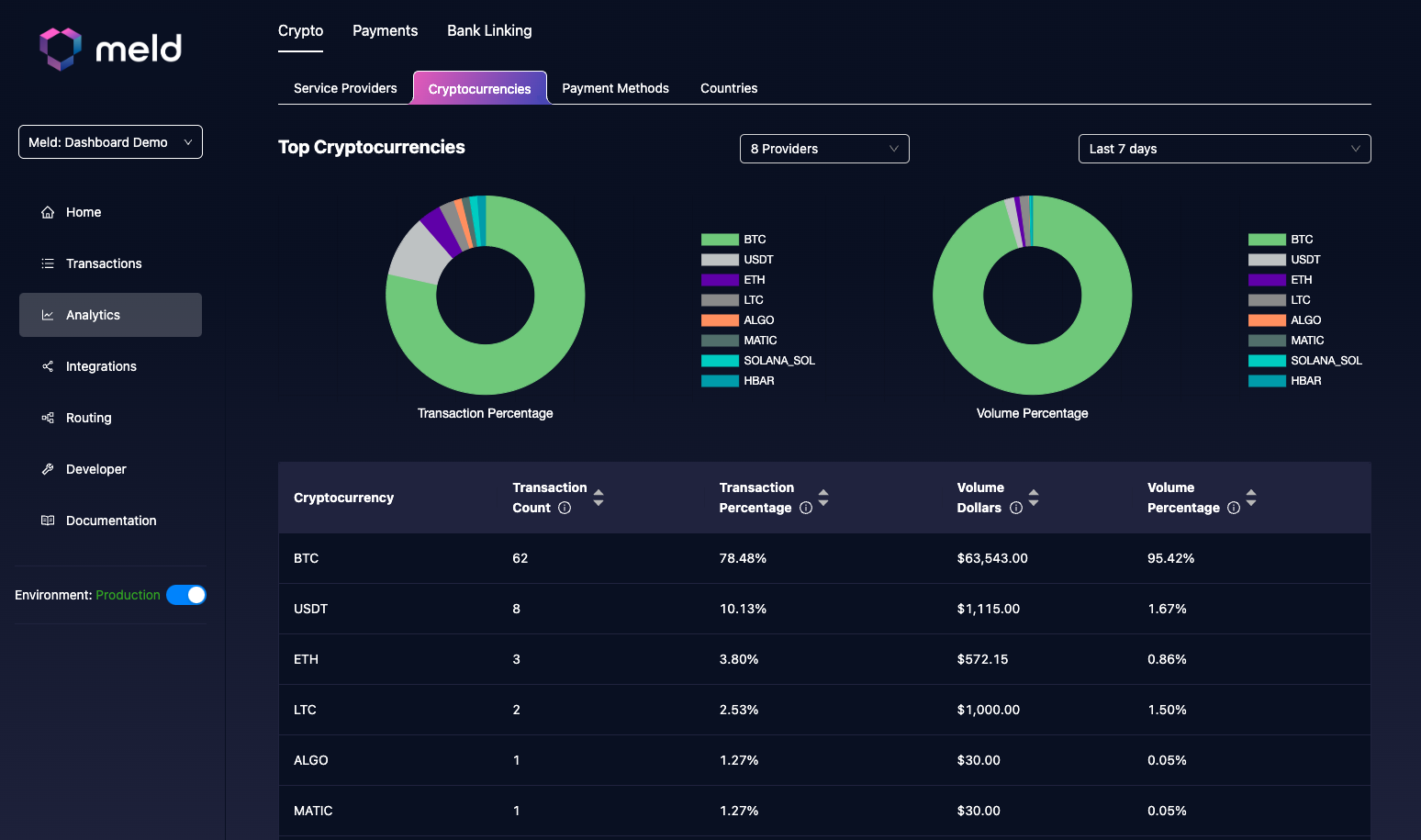 For crypto, Meld shows you the top cryptocurrencies transacted, the top payment methods used, and the top countries that users have transacted crypto from. For payments, Meld shows you the top currencies used, the top payment methods used, and the top countries that users have made payments from. All of this data can be filtered by date and service provider(s). Here is an example of how the data looks: