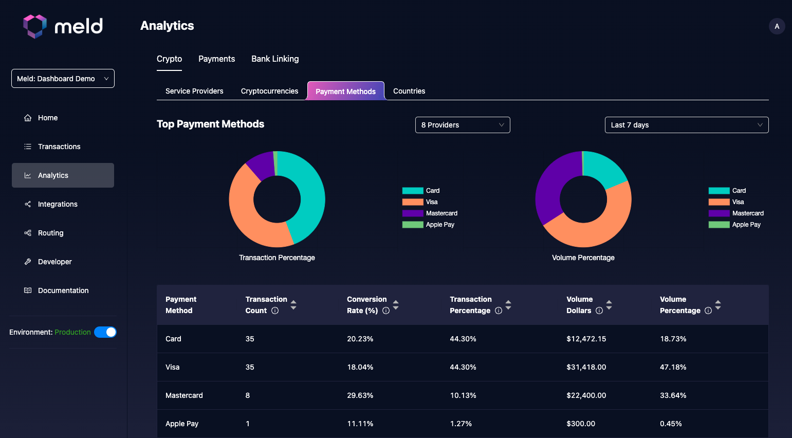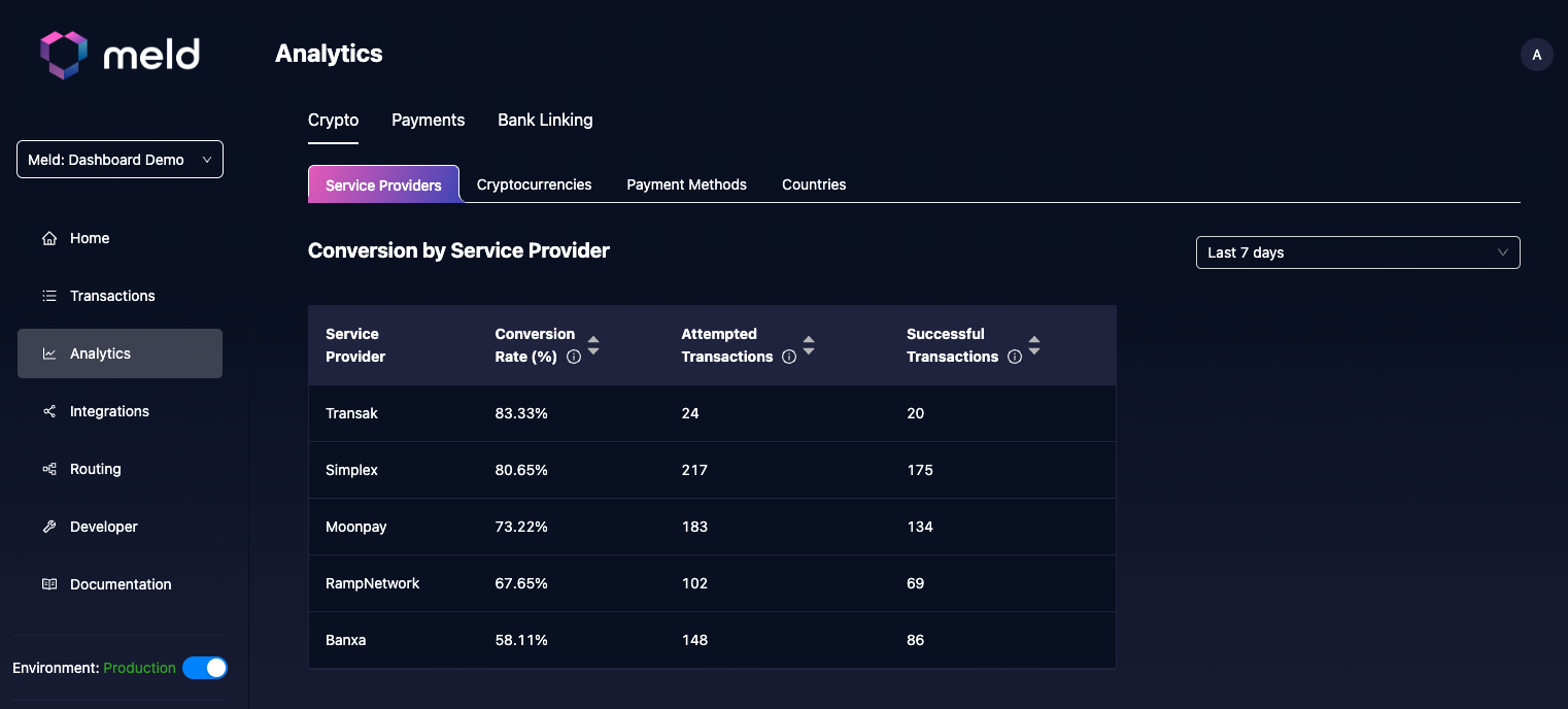 For all domains, Meld shows you conversion by service provider over a date range, so you can see which providers and performing better than others both in general and under specific conditions. Meld uses this data to nudge your users toward service providers with higher conversion rates, and you can too by leveraging routing. Here's how that data looks, using crypto as an example: