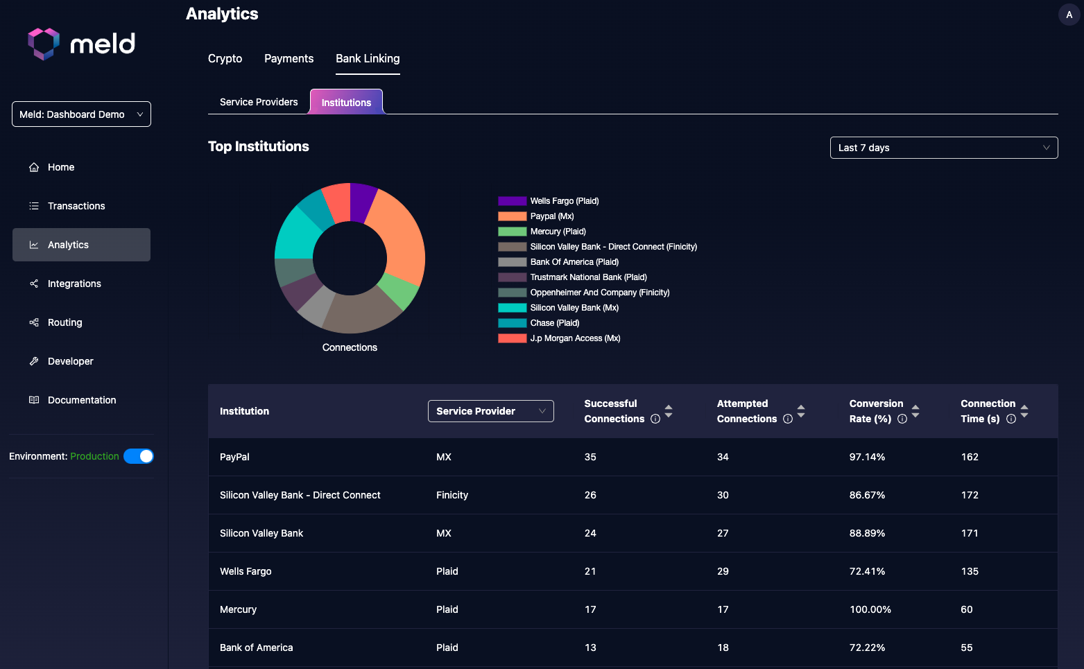 For bank linking, Meld shows you the top institutions connected to by service provider. Here is an example of how the data looks: