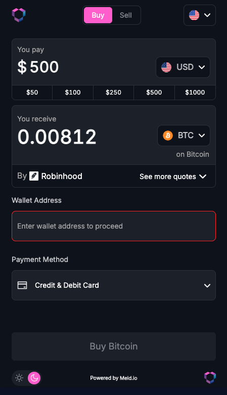 The Crypto Wizard is a standalone UI that you can embed in your website or app that has the full functionality of the Meld Crypto Stack ready to use right away. It includes a UI and the full backend feature set that allows you to have your customers purchase crypto through you and Meld with ease. The Wizard UI is linked at the end of this page.