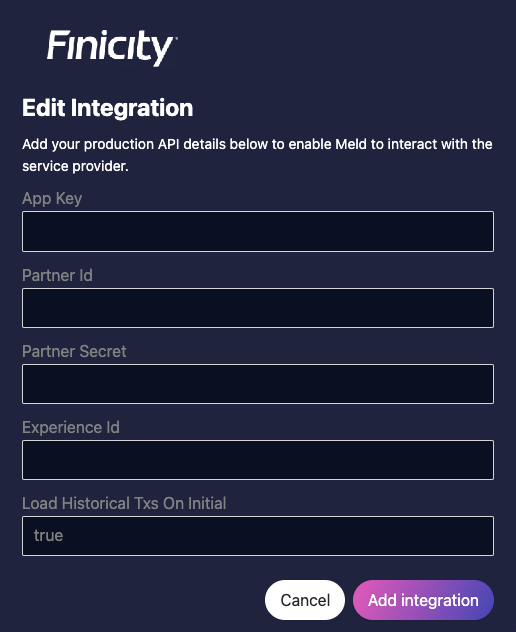 If you have your own Finicity account that you wish to integrate with Meld, you will need to provide the following credentials securely on the Meld Integrations Tab on the dashboard: