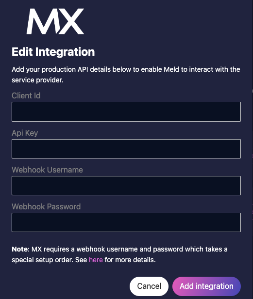 If you have your own MX account that you wish to integrate with Meld, you will need to provide the following credentials securely on the Meld Integrations Tab on the dashboard: