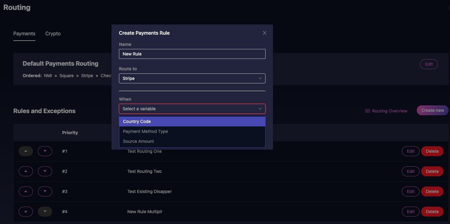 Payments routing can be used to route the user to the best payment service provider to complete their transaction. There are 3 conditions that can be used for routing: