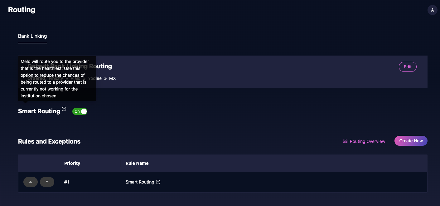 Meld collects data from providers on the current status of each of their institutions as well as individual products that the institutions return. If you select the Smart Routing option in the dashboard, Meld will avoid routing you to providers for institutions known to be not working for that provider. For example, if a user selects Chase as their institution, if Meld knows from Plaid that their Chase integration is currently offline, then Meld will route the user to a different provider besides Plaid. Use this routing rule to reduce the chances of the user being led to an integration that is currently offline or being repaired.