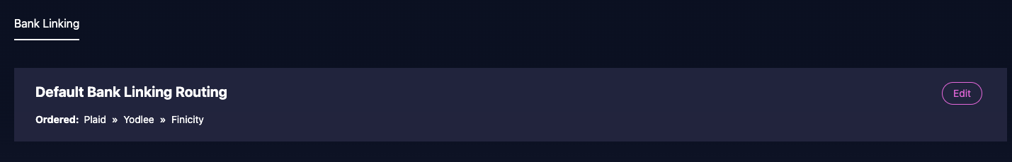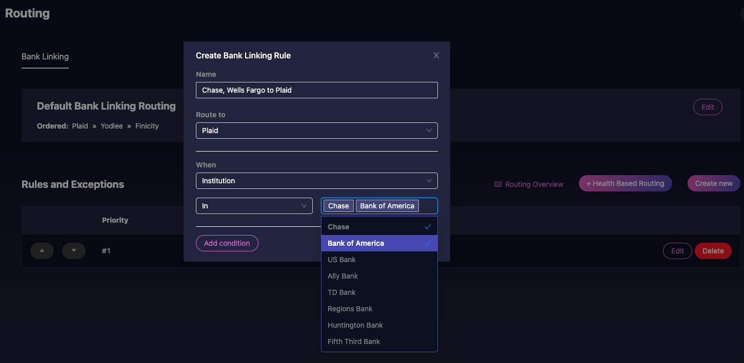 Bank Linking Routing can be used to route to user to the best provider to complete their connection. Aside from the default routing rule, you can set up custom rules with conditions on where to route the user. Currently, you can select an institution or a list of institutions and route users trying to connect to them to a particular provider. For example, you can set it up so that users trying to connect to Chase or Bank of America go through Plaid, whereas users trying to go to Wells Fargo or US Bank go through Finicity.
