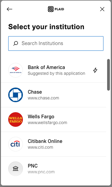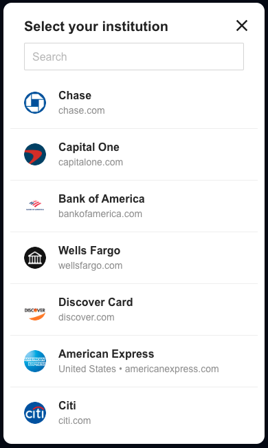 Once you launch the widget, the next step is for the user to pick their institution (aka bank).