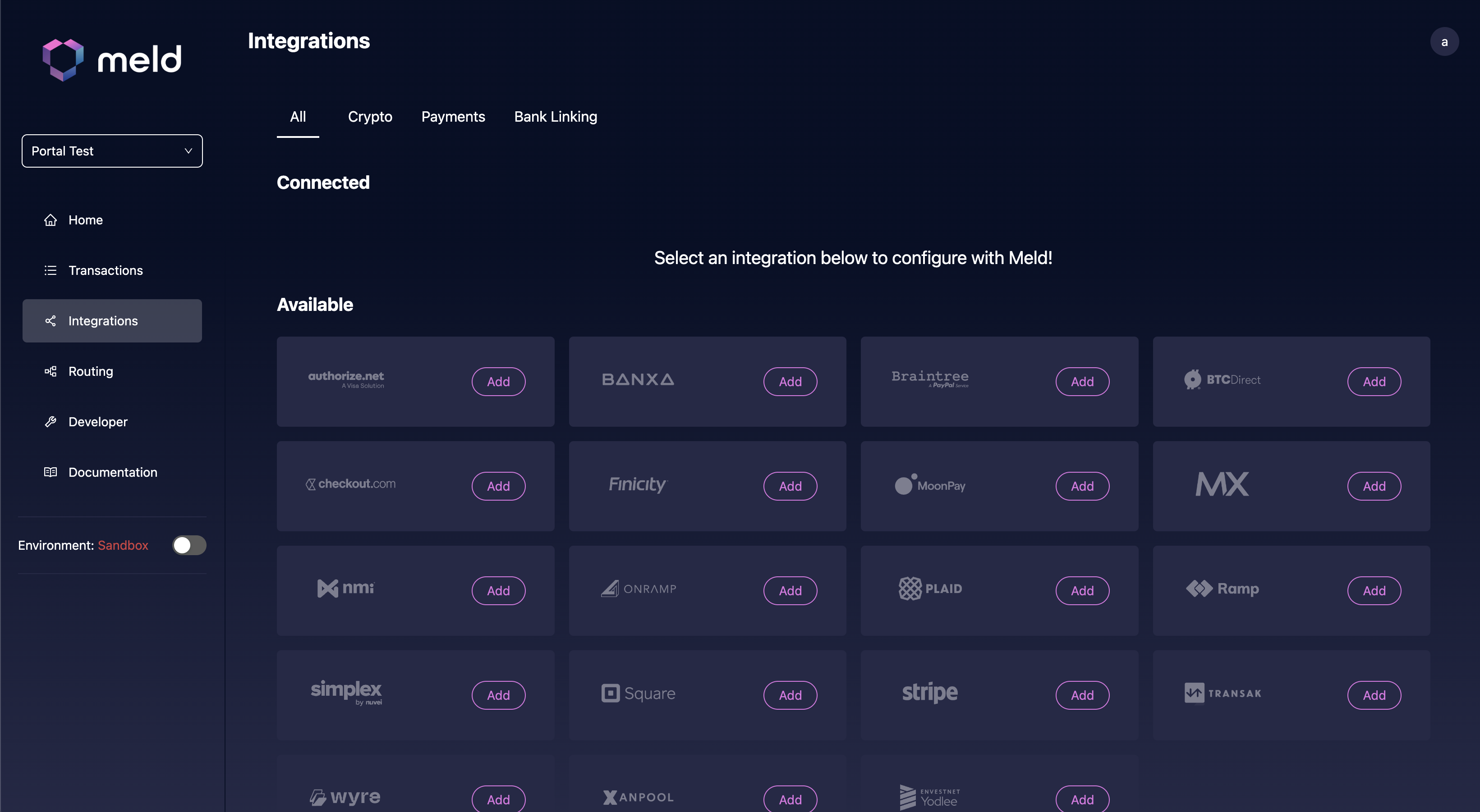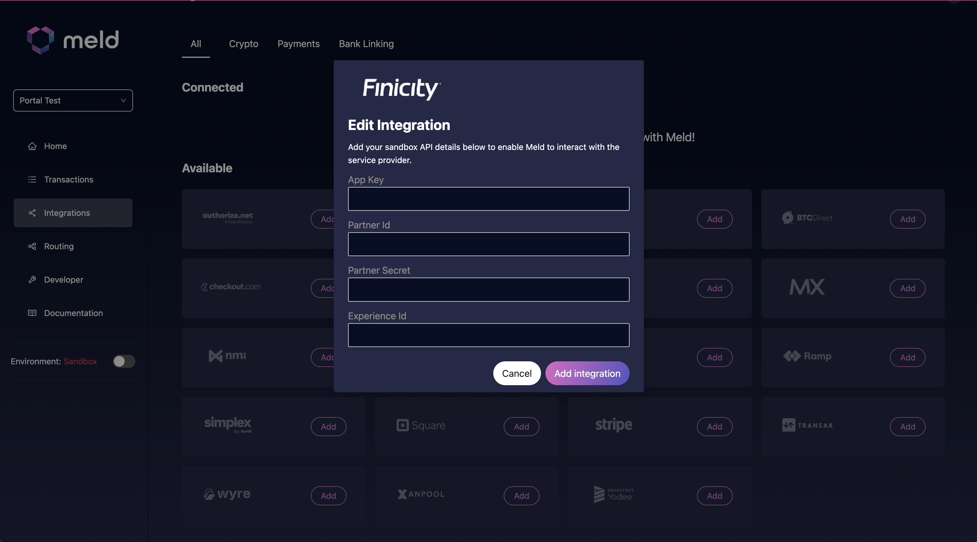 Click Add Integration to save the details. You can add 1 of each integration per account. For example, in a single account, you can have 1 Finicity integration. Once you complete this step, Meld will have access to your credentials for all your providers and store them under a single API key.