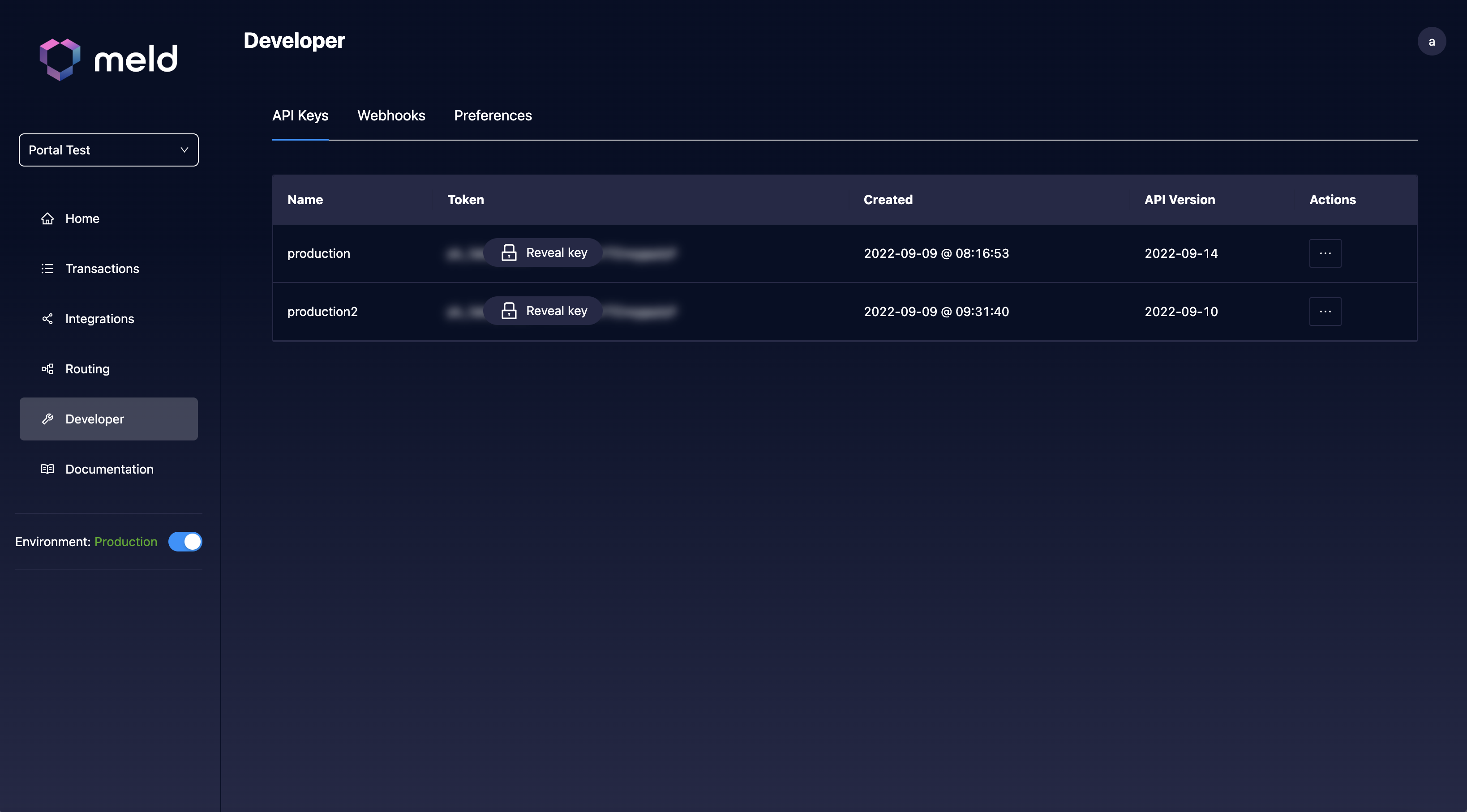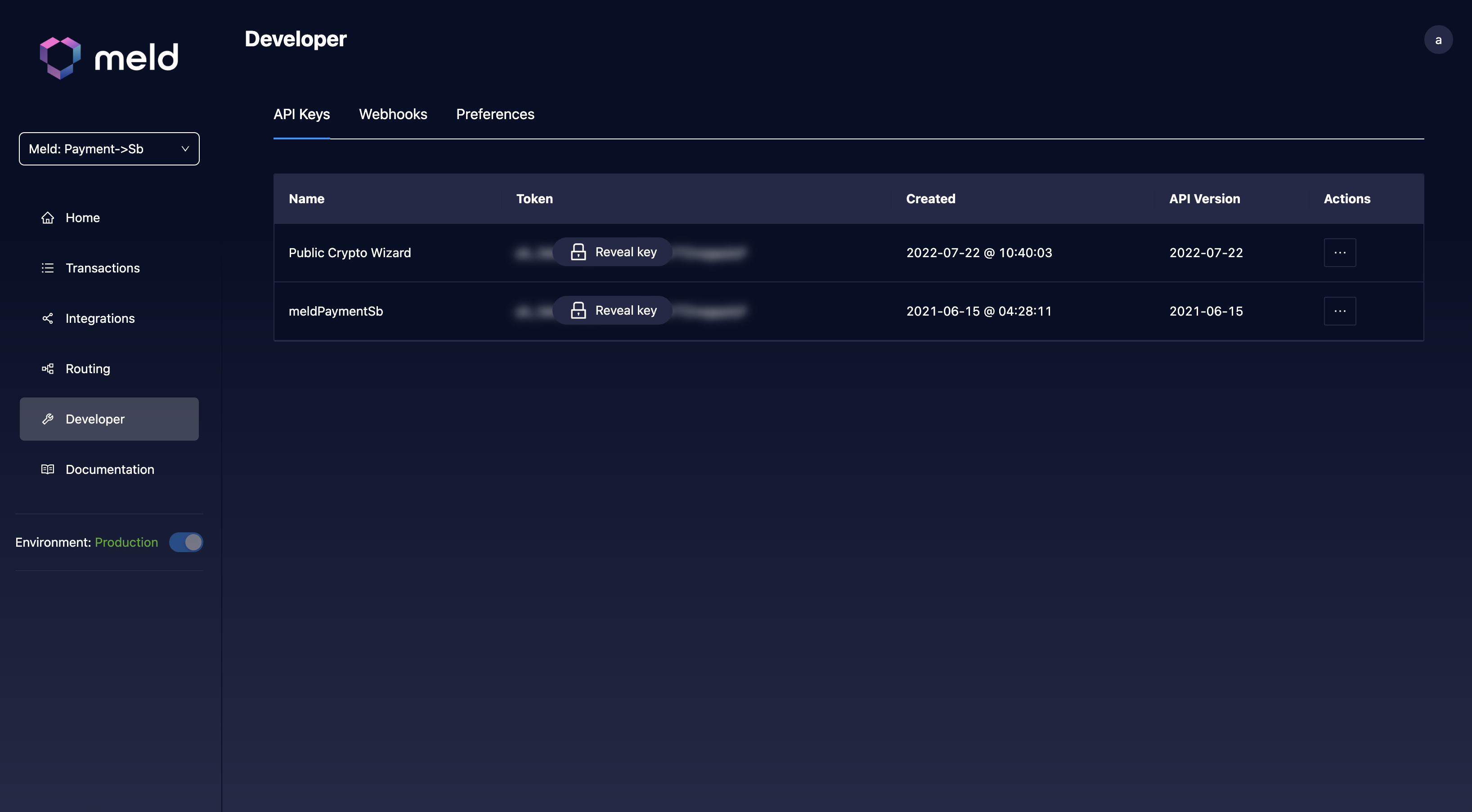 Keys named Production and Sandbox are private keys you will use to call Meld's API. Production keys are in Meld's production environment, and Sandbox keys are in Meld's sandbox environment. Remember to put the word BASIC in front of the key when making an API call.