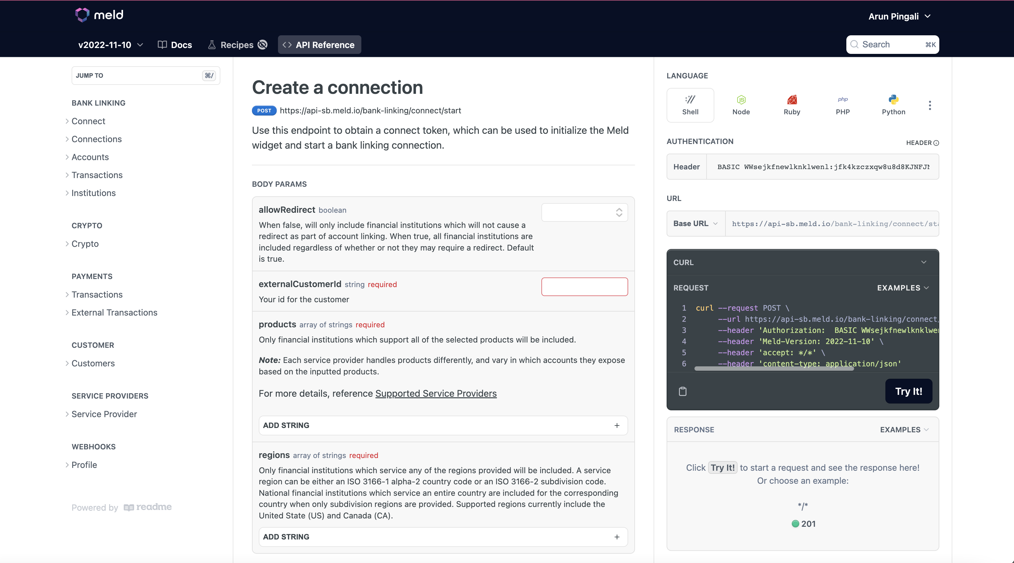 Use your API key to start making API calls in Meld's docs. Take a look at the Bank Linking API reference, the Crypto API reference, or the Payments API reference. Make sure you put the word BASIC in front of your key in the Header section.