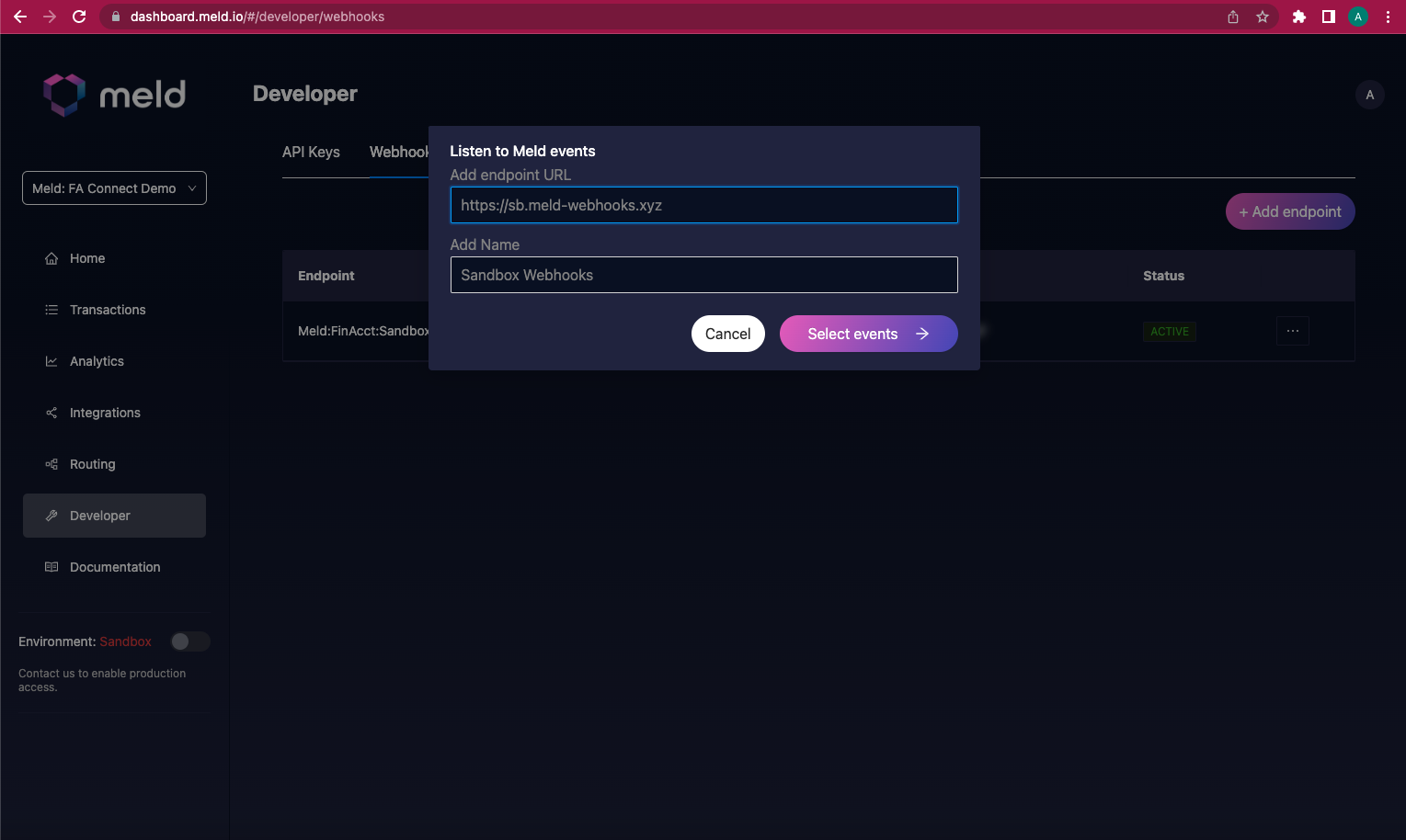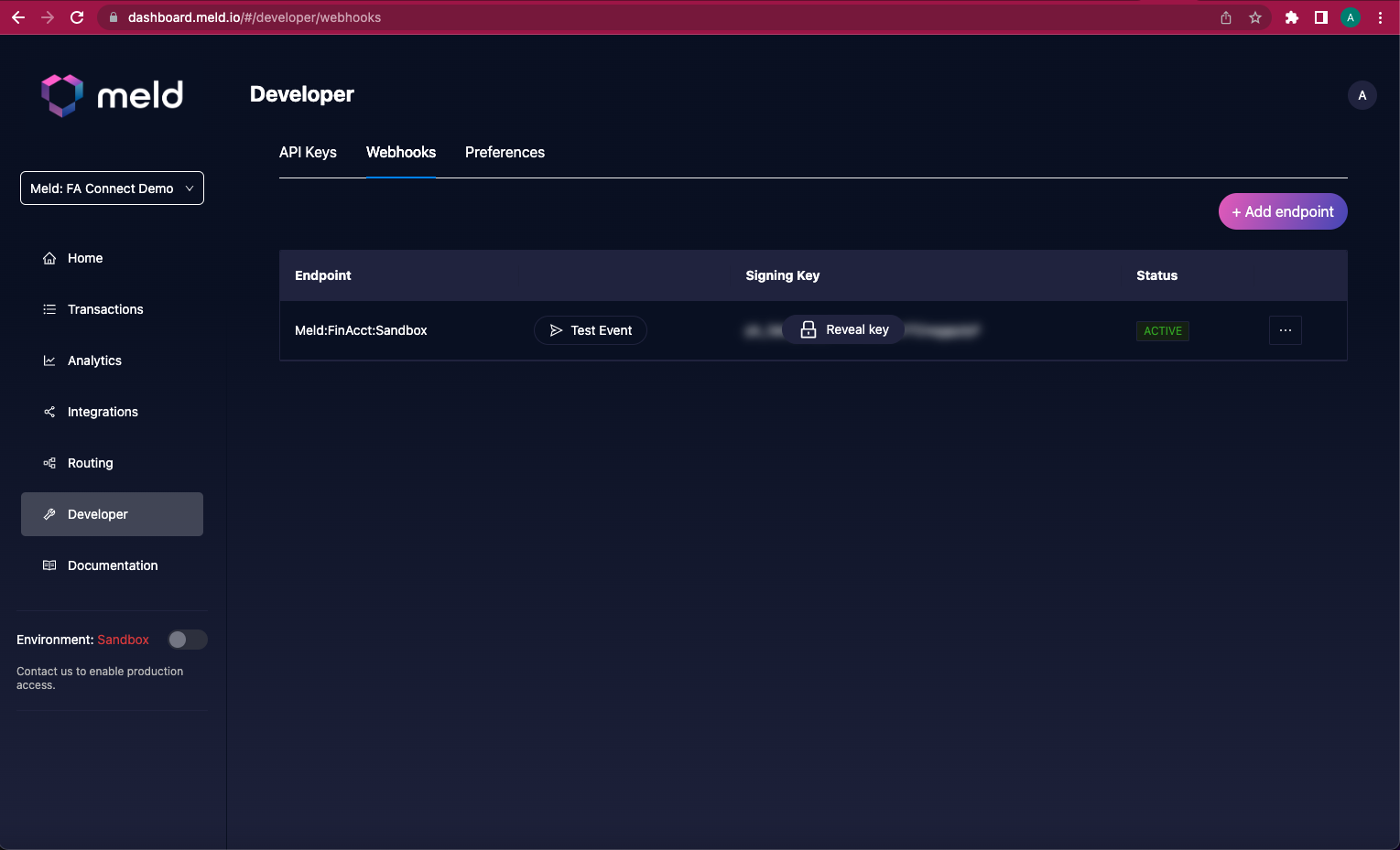 All of the below steps for configuring webhooks to be sent to you from Meld can also be done through the UI in the Developer tab of the Meld dashboard, which we recommend for ease of use.