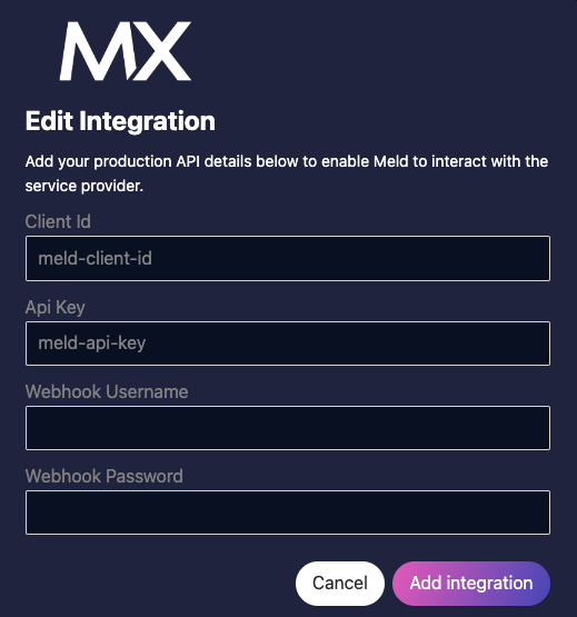 MX specifically requires a webhook username and password when setting up webhooks to Meld. However, Meld needs your MX API Key and Client ID before we can generate a url for you to use set up webhooks in the MX dashboard. Therefore when setting up an MX integration, the recommended order of operations is for you to add your API Key and Client ID for MX in the dashboard, then after we provide you with a Meld webhook url, use that to go and set up a webhook profile on MX's dashboard, along with setting up a username and password. Then come back to Meld's dashboard and add the username and password to the MX integration credentials.
