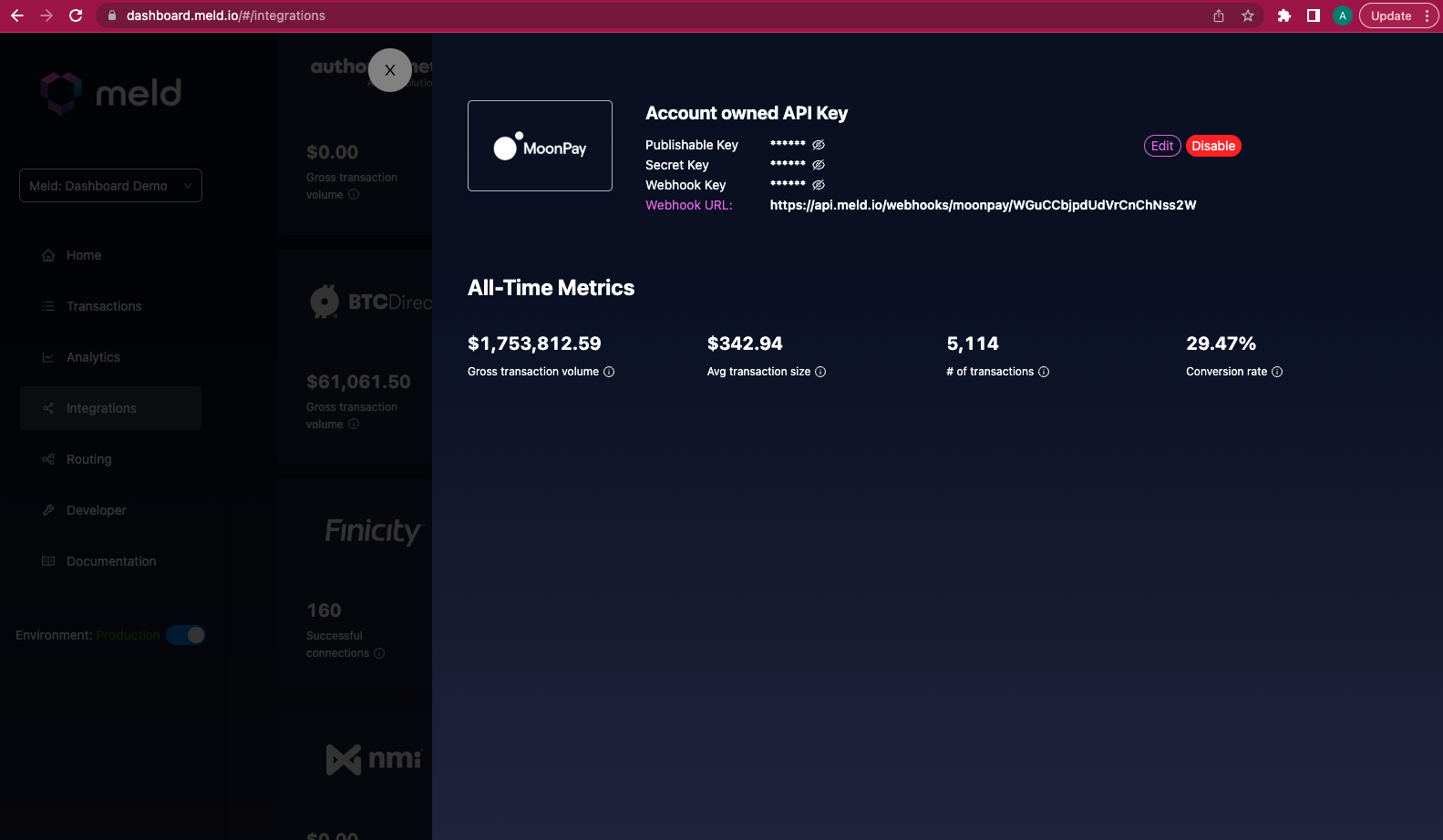 Not all service providers have a dashboard, so for those who don't, you may have to reach out to them directly so that their team can set this up for you. Once you complete both these steps, Meld will start receiving webhooks from the service provider whenever transaction or connection information changes, and we will pass on that information to you in Meld's outbound webhooks, described in the next section.