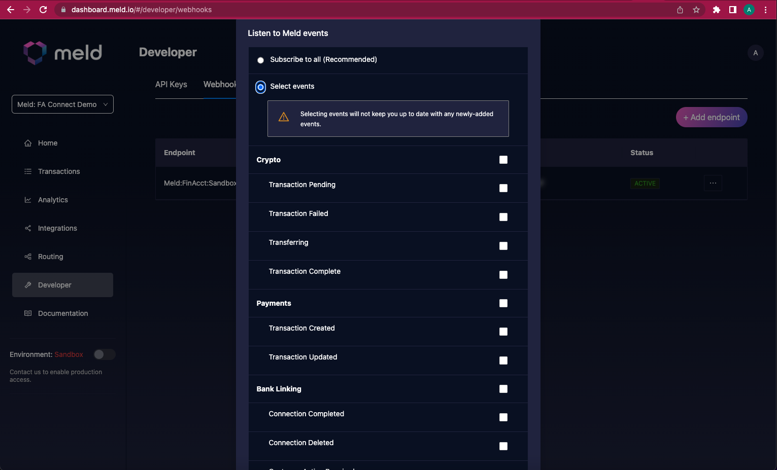 Select the events you would like to receive webhooks for. Meld recommends subscribing to all webhooks so that you don't miss any updates. Then hit "Add Endpoint" and you are good to go!