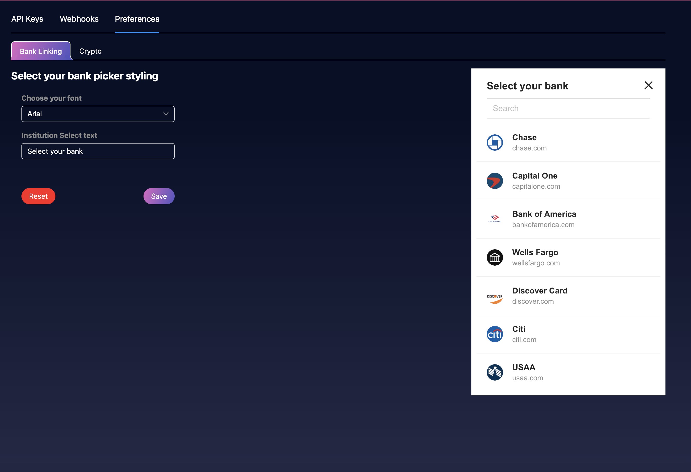 Meld offers the ability to customize several UI elements of your meld connect widget through the Dashboard, in the Developer tab. You can customize the following options: