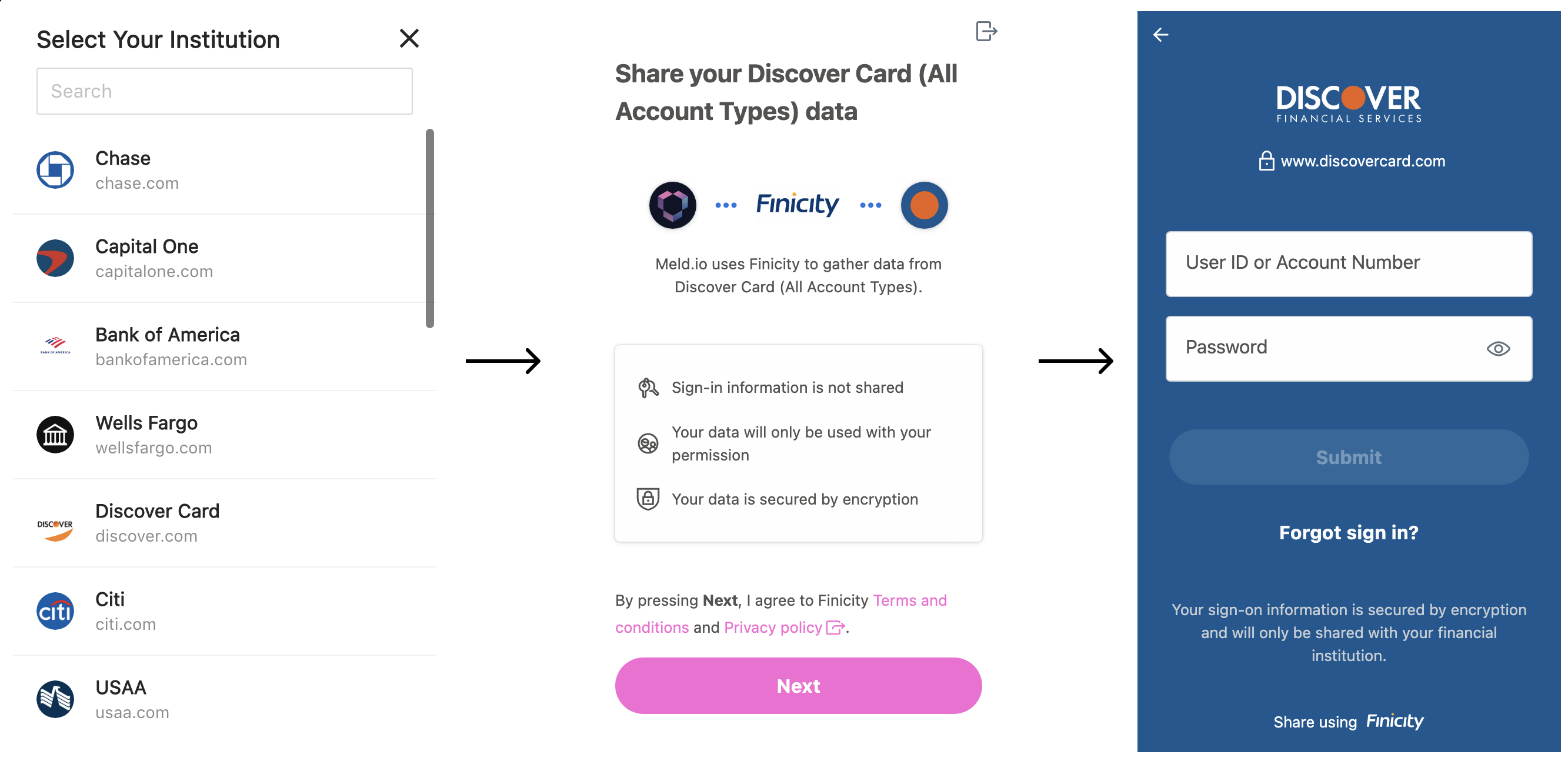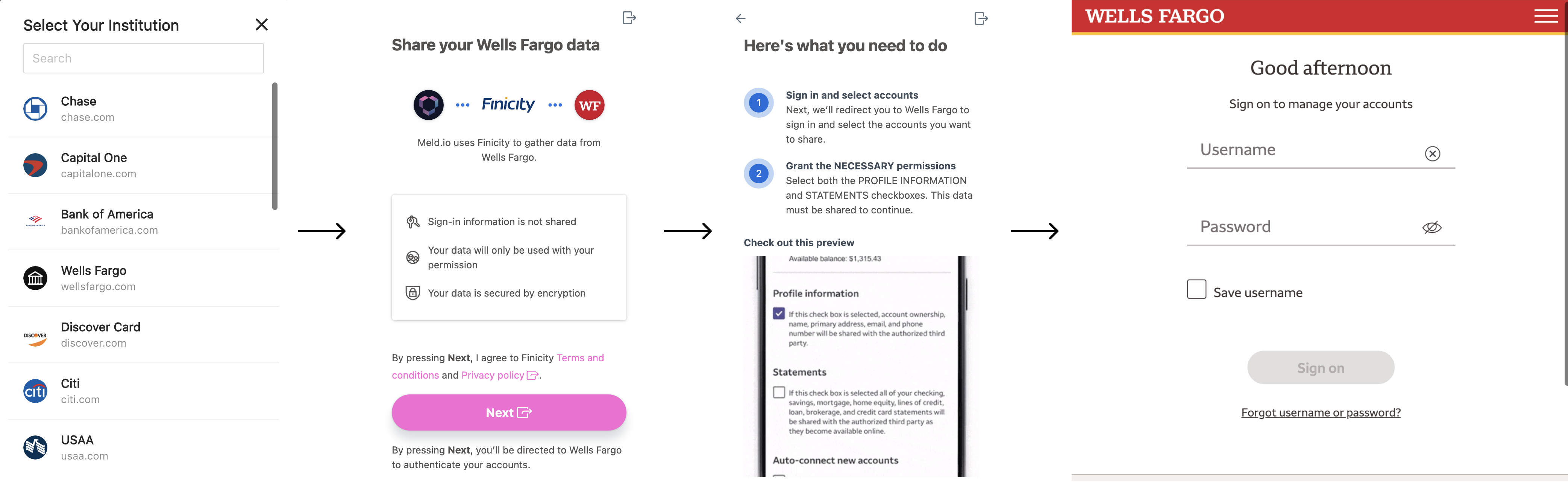 Note: Finicity users are directed straight to the institution login page and do not need to go through another picker.