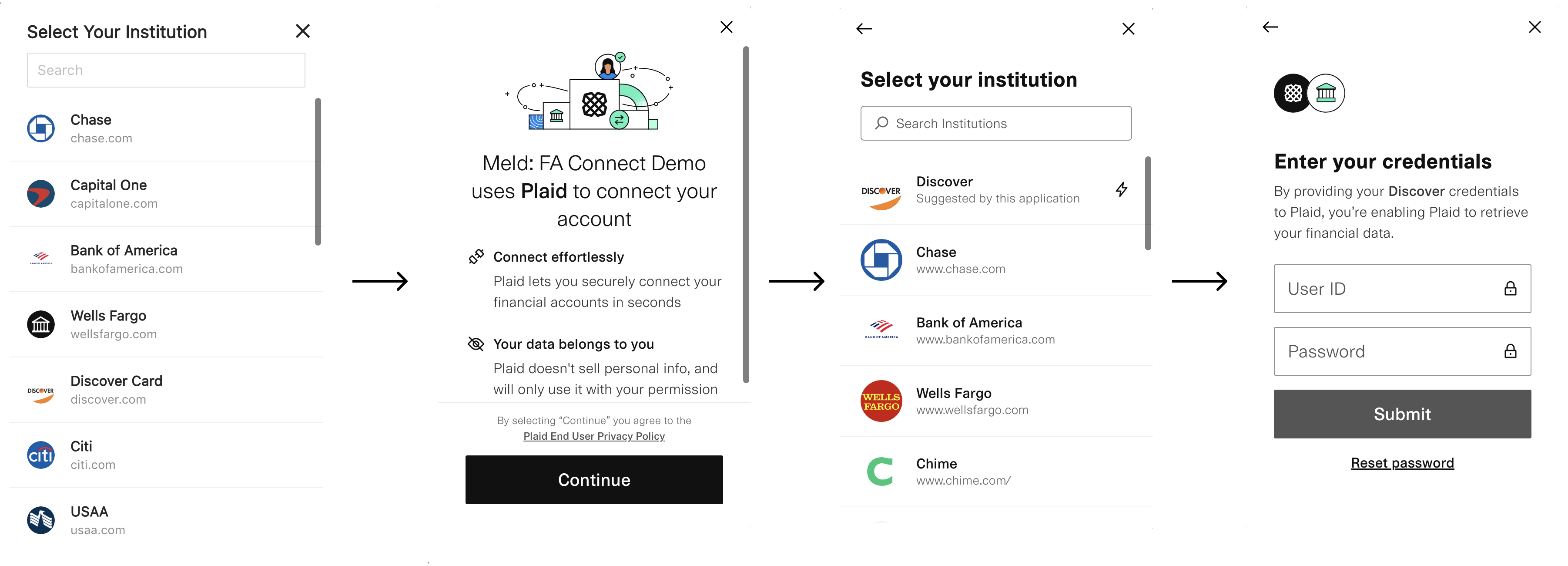 Note: Plaid requires their picker to be used in addition to Meld's picker. When possible, Meld signals to Plaid to provide a "suggested" lightning bolt next to the institution selected (in this case, Discover).