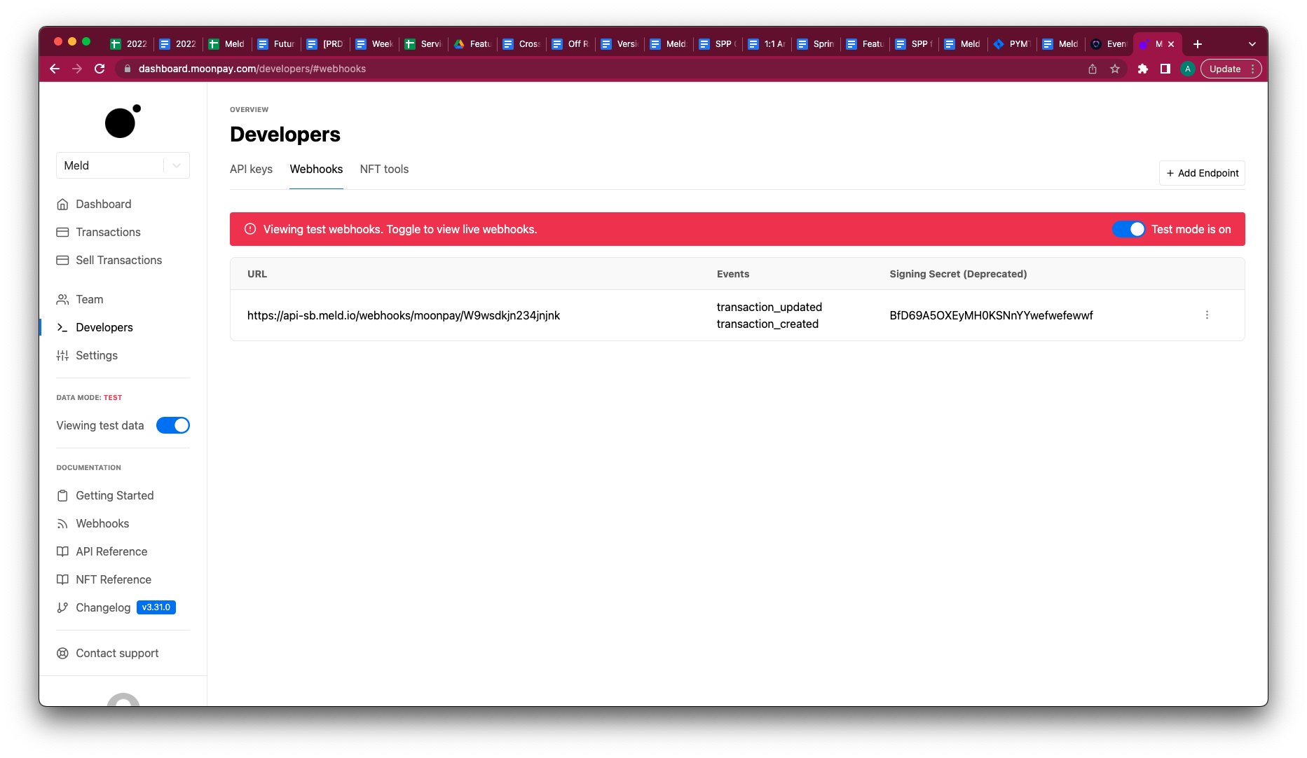 All of the below steps for configuring webhooks to be sent to you from Meld can also be done through the UI in the Developer tab of the Meld dashboard, which we recommend for ease of use.