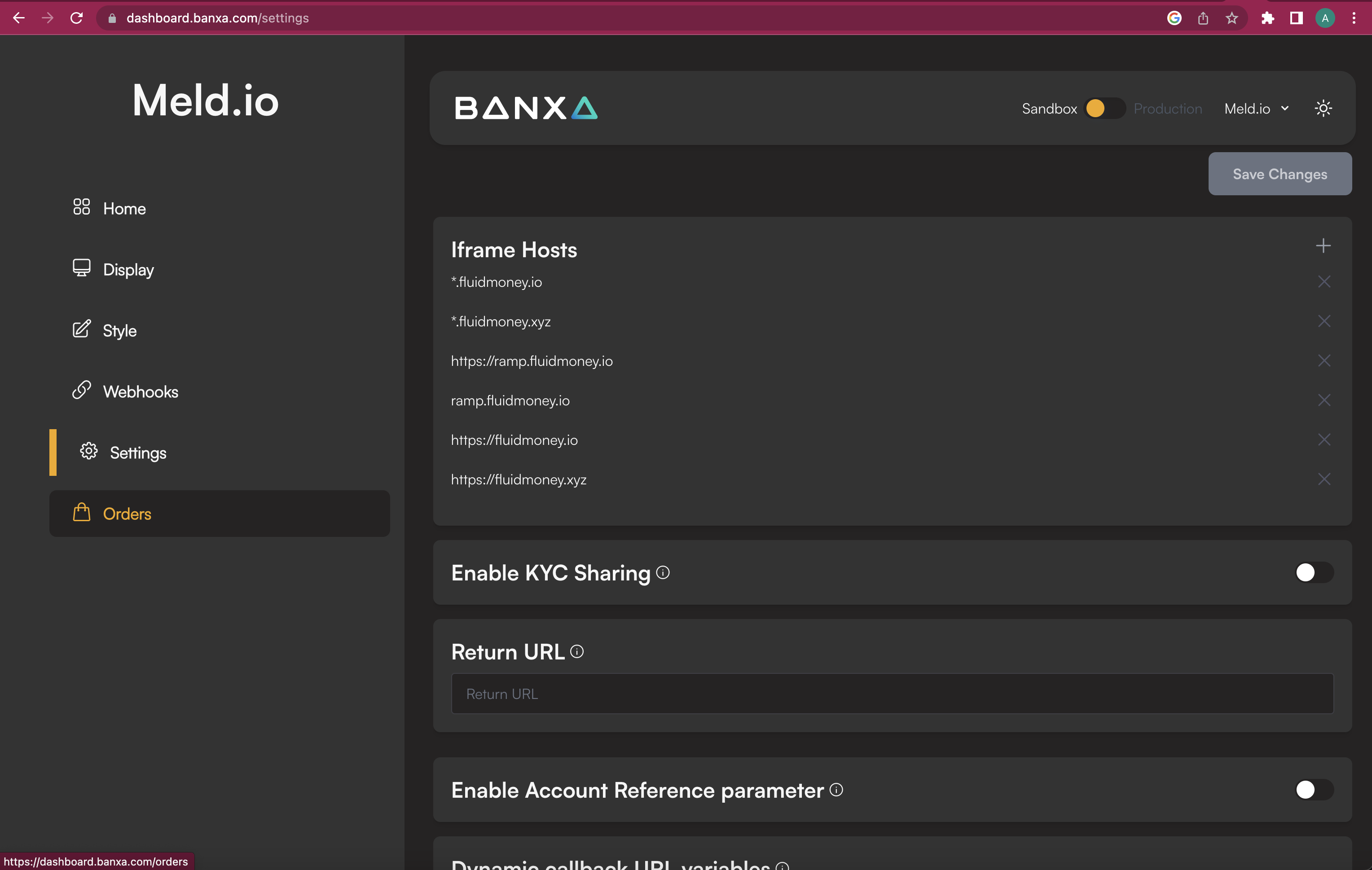 Moonpay, Banxa, Simplex require you to whitelist Meld's URLs to allow their widgets to load within Meld's iframe. For Moonpay and Banxa, you can whitelist Meld's URLs (https://www.fluidmoney.xyz, https://sb.fluidmoney.xyz, https://fluidmoney.xyz) yourself through the respective partner dashboards. For Simplex, ask your account manager to whitelist those urls. Here is how to whitelist the urls on Moonpay's dashboard: